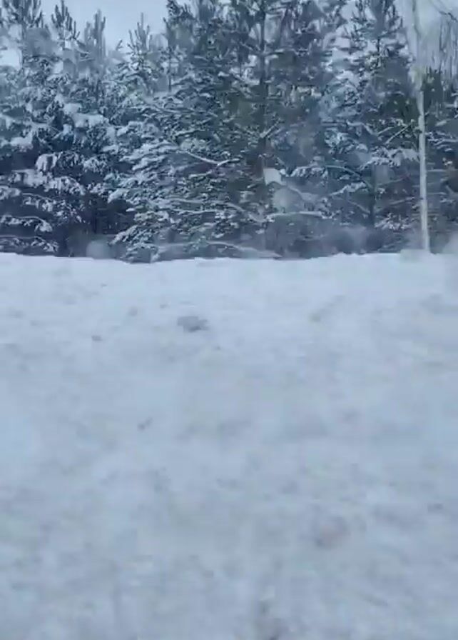 The camera films a snowy rural scene from a low-angle perspective