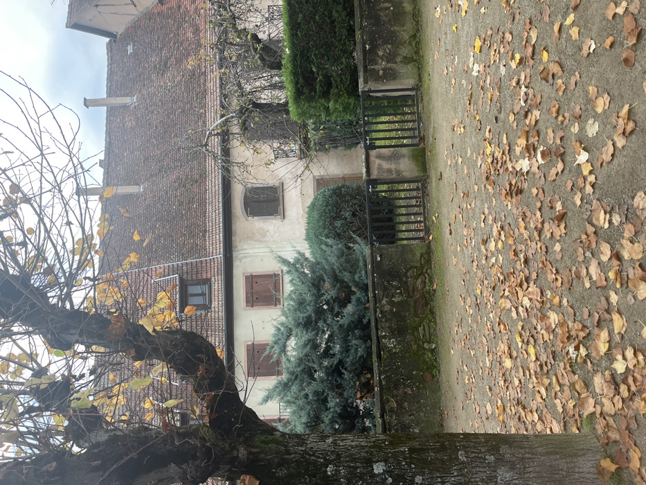 The image depicts an autumnal residential scene in Obernai, France, under an overcast sky. The foreground consists of a ground surface largely covered by scattered brown and yellow fallen leaves. To the left, the textured trunk of a deciduous tree with mostly bare, gnarled branches and a few remaining yellow leaves occupies the left side of the frame. In the midground, a low, weathered stone wall, exhibiting patches of moss, runs horizontally across the scene. A black, two-leaf metal gate, slightly ajar, is set into the center of this wall. Behind the wall, a variety of dense green and bluish-green evergreen shrubs are visible. The background features a two-story building with a light-colored, possibly stuccoed, facade. The lower level of the building has three windows: two on the left with closed, reddish-brown wooden shutters (one featuring heart-shaped cutouts), and one on the right with closed, dark-colored shutters. Above, a reddish-brown tiled gabled roof supports two visible dormer windows and two tall chimneys. Sparse, bare tree branches are discernible against the right side of the building's facade and roofline.