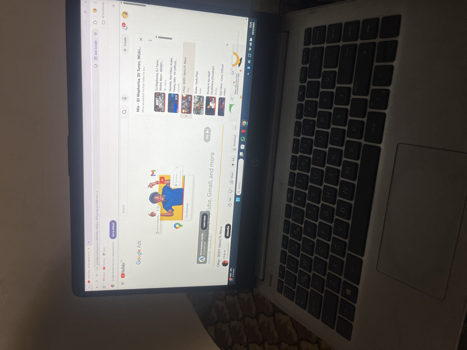 laptop screen displaying a YouTube page with a mix of music by DJ Maphorisa, DJ Tunez, and Wizkid. There are also ads related to Google Ads and business promotion. The user appears to be logged into their Google account, with options for Gmail and YouTube available. Other video suggestions include "Okay-Body (danz) ft. Mavo", "Drake-God's Plan", and "Shoday & Ayo Malf-Casablanca (Visualizer)". A Google search bar and Chrome settings are visible in the browser. The keyboard is visible on the right.