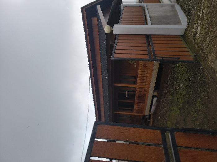 A low-angle, rotated view shows a brown wooden house with a dark roof and a light-colored trim. A gate with brown panels and a black metal frame stands in front. The side of the house features a row of windows and a porch area. The ground is covered with gravel and some sparse vegetation. The sky is overcast, creating a diffused light.