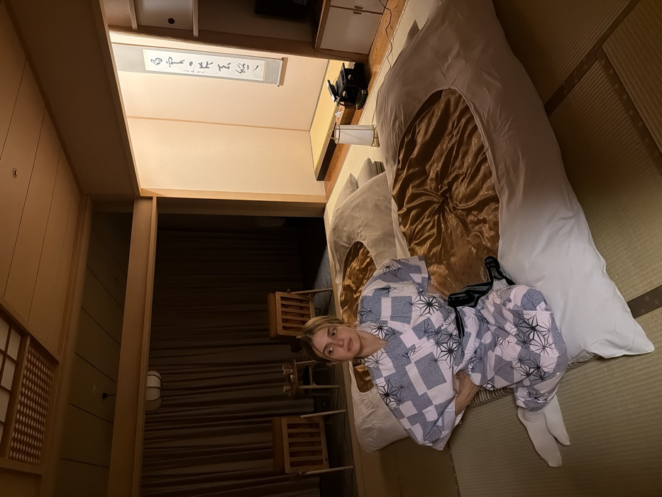 The image displays a traditional Japanese-style room, likely a guest room in a ryokan located in Hakone, Japan. The room is softly illuminated with warm, ambient light and features a floor entirely covered in tatami mats. A single female subject, appearing to be in her 20s or 30s with light brown hair, is centrally positioned in the lower half of the frame. She is seated on her knees on a white pillow placed on top of a futon mattress. She wears a patterned yukata, predominantly white and light blue with geometric and star-like motifs, cinched at the waist with a black obi. White tabi socks are visible on her feet. Her hands are resting on her waist, and she is looking slightly upward and to the left, maintaining a neutral expression. In the immediate foreground, two futon mattresses are laid out on the tatami floor. Each futon is encased in a white sheet, revealing a circular section of wrinkled, golden-brown fabric at its center. To the left in the background, a more dimly lit section of the room is visible, separated by a wooden beam. This area contains two wooden chairs with light cushions, positioned with their backs to the viewer, and a small, round wooden table between them holding two small cups. Dark brown curtains are drawn behind this seating arrangement. A single cylindrical paper lantern hangs from the ceiling in this section. To the right in the background, a lighter-toned wall features a traditional Japanese calligraphy scroll (kakemono) hung centrally above a raised tatami platform (tokonoma). To the right of the scroll, a built-in shelving unit with light-colored panels houses a dark electronic device. On the tatami floor near the right futon, a rectangular paper lantern and a dark, possibly wooden, decorative or functional object are present. The ceiling is light brown with exposed wooden beams and a square, checkered light fixture in the upper left.