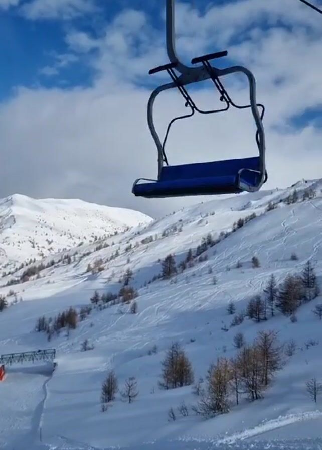 ski lift moving over a snowy mountain landscape. The sky is blue with scattered clouds. The mountain is covered in snow and sparse trees. The ski lift chairs are blue and black, and some carry passengers. A yellow sign warning of avalanche danger is visible in the foreground. The camera moves with the ski lift, providing a view of the terrain below.
