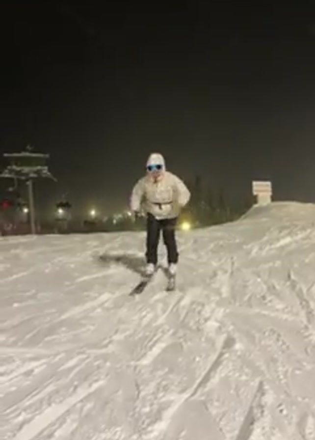 A person wearing skis, a winter jacket with a hood, ski goggles, black pants, and gloves is standing on a snow-covered slope at night. They are spreading their arms out to the sides and moving their skis in a way that looks like they are practicing snowplow turns. It is snowing lightly. Behind the person is a ski lift and a small hill with a sign on top. The area is lit by artificial lights.