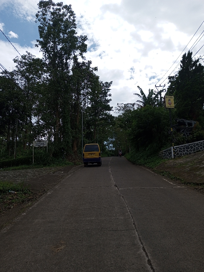 An outdoor scene depicts a two-lane concrete road extending uphill and curving slightly rightward into the distance. A yellow minivan with blue trim on its lower body is parked facing away from the viewer on the left side of the road, appearing to be stationary. Further up the road, a person on a motorcycle is visible. Both sides of the road are densely bordered by tall, green trees and lush vegetation. On the left side, behind the parked minivan, a white rectangular sign with black lettering reads "MASJID BUSTANUL JANNAH". On the right side of the road, a yellow square sign mounted on a pole displays black text that reads "POLISI" at the top and "POLSEK BARATAN" below. Beneath this sign, a dark-colored statue, possibly of a large animal like a bear, is situated on a low, stone-patterned wall. Overhead power lines traverse the upper portion of the image against a partially cloudy sky with patches of blue. The linguistic content on the visible signs, "MASJID BUSTANUL JANNAH" and "POLISI POLSEK BARATAN," indicates that the depicted location is in Indonesia, not Ariyalai, Sri Lanka.