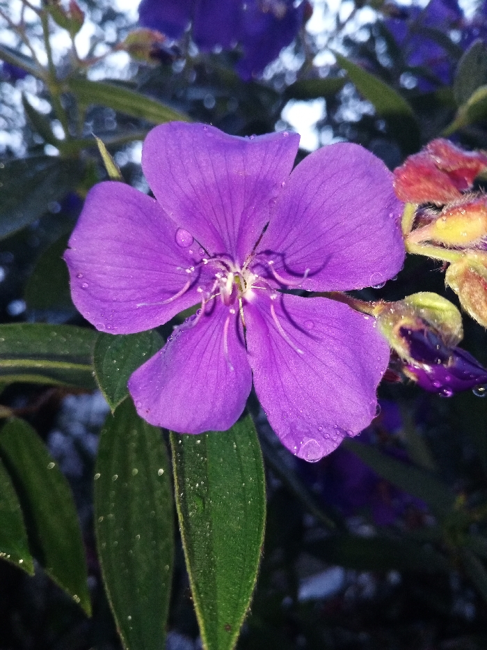 A close-up photograph displays a vibrant purple flower with five broad petals, centrally positioned. Water droplets are visible on the petals and the light-colored stamens in the flower's core. Below the main flower are dark green leaves, also bearing water droplets. To the right, a cluster of unopened flower buds, some with reddish-brown fuzzy textures and others showing purple tips, are present and wet. The background is blurred, featuring out-of-focus purple flowers and green foliage against a lighter, indistinct sky. The scene is located in Catarman, Philippines.