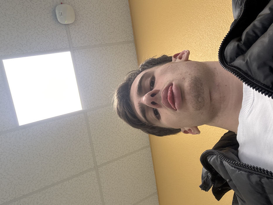 A low-angle, close-up photograph depicts a young adult male facing the camera directly, his tongue partially extended