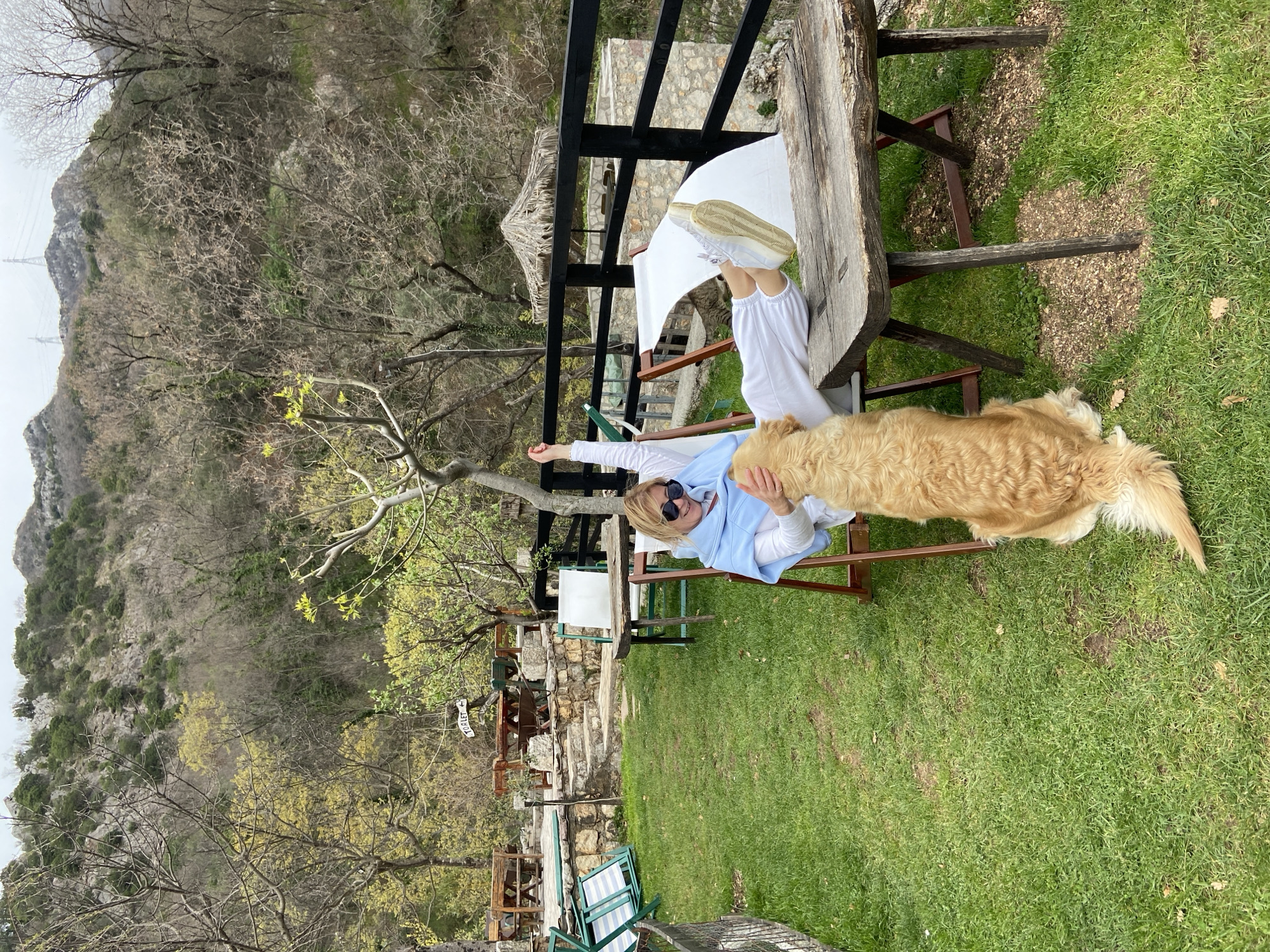 A woman in white pants and a light blue hoodie lies on a wooden bench outdoors, with her feet elevated on the bench. She wears sunglasses and is petting a golden retriever dog lying next to her on the grass. The area appears to be a garden or patio with green grass and trees in the background. A wooden railing and various outdoor furniture are visible. In the distance, a mountain is seen. The location is not provided in the image.