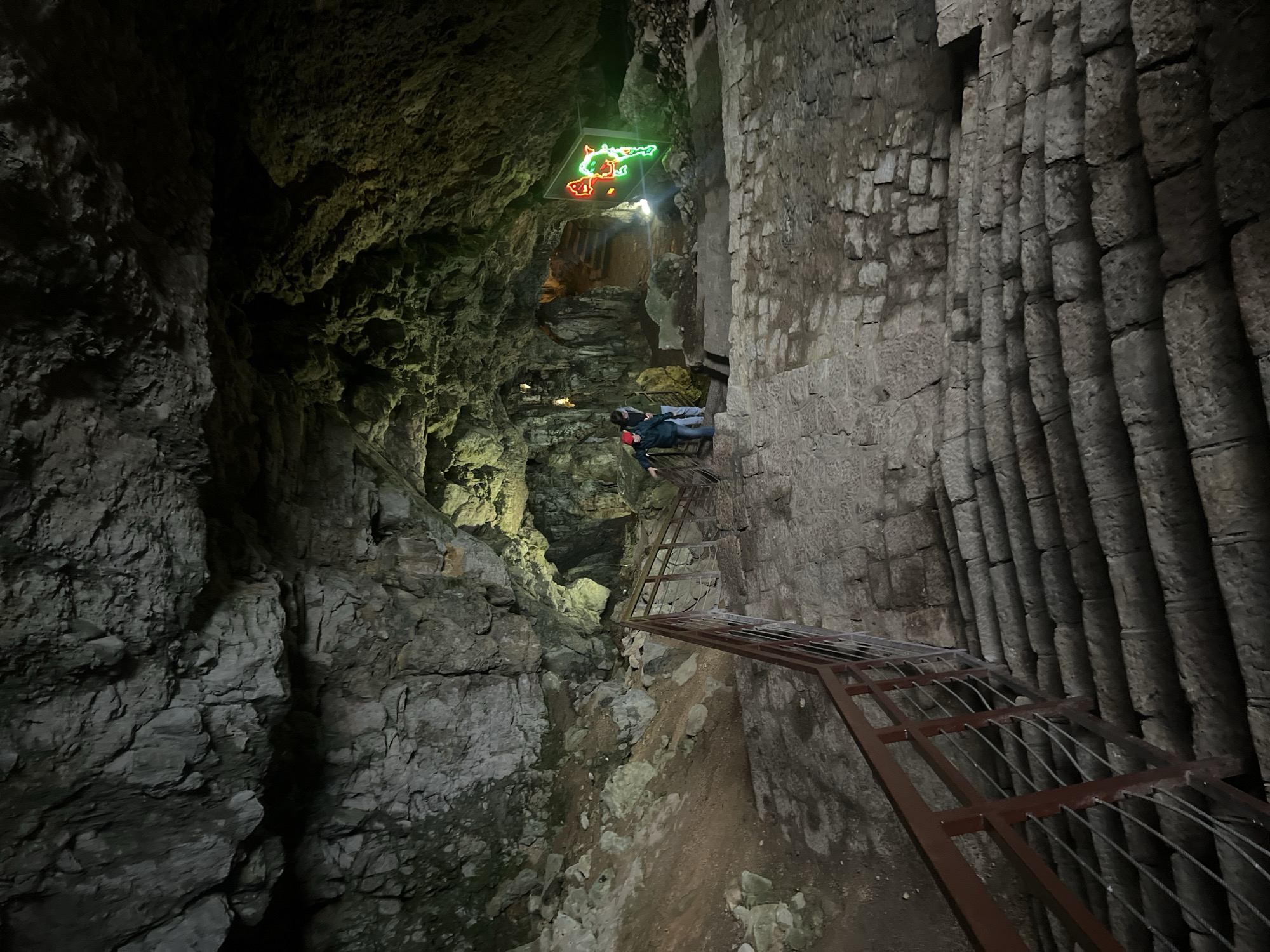 The image depicts the interior of Resavska Pećina (Resava Cave) in Despotovac Municipality, Serbia. The scene is illuminated by artificial lighting, revealing a constructed visitor pathway through the natural cave environment. In the foreground, a wide, uneven stone staircase descends towards the viewer, equipped with a metal handrail on the left featuring a reddish-brown top bar and multiple horizontal wire cables. The stone steps appear damp or worn. In the midground, two individuals are visible on a landing area between sets of stairs. One person, wearing a dark jacket and a red cap, stands closer to a secondary railing segment on the left. The second person, largely obscured, stands slightly behind and to their right, wearing a lighter-colored top. Both individuals appear to be descending the pathway. To the left of the pathway, the natural cave floor consists of loose rock fragments and soil. The cave walls and ceiling throughout the visible area display rugged, irregular rock formations. Artificial lights cast various hues, with some areas exhibiting a yellowish-green tint on the rock surfaces. In the background, further into the cavern, a prominent display board with red and green neon lights outlines a map or schematic, characteristic of the Resava Cave's visitor routes. Beyond this, a darker passage suggests additional chambers or pathways. The overall environment is a semi-dark, subterranean space made accessible and traversable by engineered stone steps and railings.
