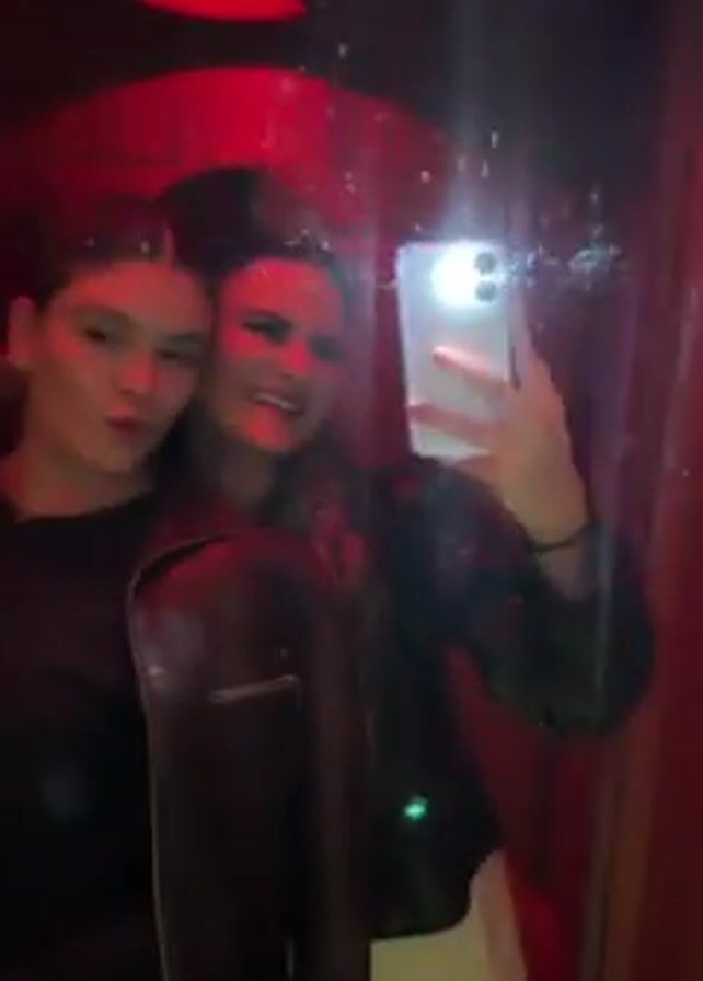 Two women are taking a selfie in front of a mirror. The woman on the left has her hair pulled back and is wearing a black shirt. The woman on the right has longer hair and is wearing a leather jacket and light-colored pants. The room is dimly lit with a red light hanging from the ceiling. The mirror is slightly dirty.