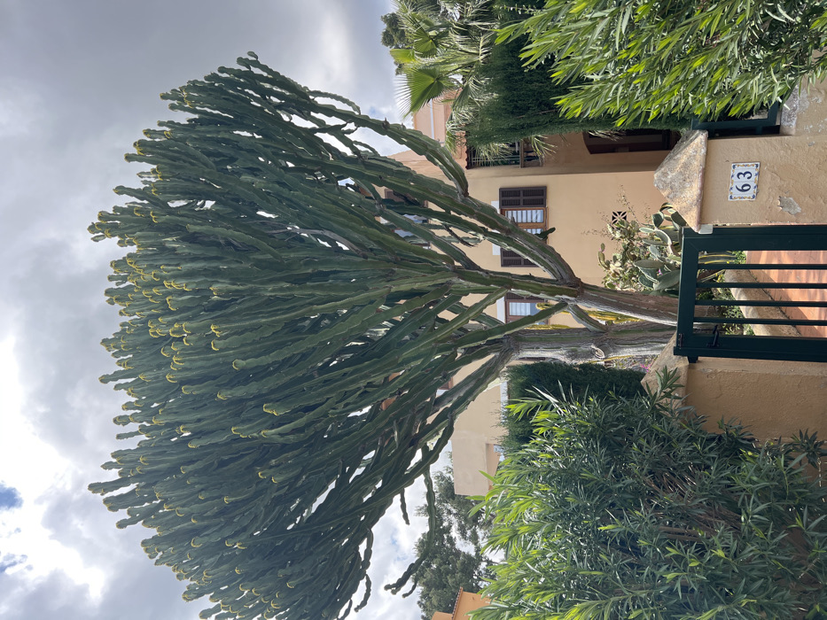 This image depicts a residential outdoor scene in Sant Llorenç des Cardassar, Spain, under a partially cloudy sky. A large, multi-stemmed *Euphorbia* succulent tree dominates the center, characterized by numerous tall, segmented, dark green columnar branches with yellowish tips, likely new growth or small flowers. Its thick, lighter-colored trunk and main stems are visible at the base. Behind the *Euphorbia*, a two-story building with light orange stucco walls is partially visible. It features several rectangular windows with closed dark brown louvered shutters; one window on the first floor has its shutters partially open. A dark, arched entryway is present on the right side of the building. The property is surrounded by dense green vegetation, including broadleaf shrubs in the foreground, coniferous hedging, and a fan palm tree on the right. Smaller cacti are also visible at ground level near the main plant. In the lower foreground, a dark green metal gate with vertical bars is situated between two light orange masonry pillars with weathered, flat caps. The right pillar displays a white tiled house number plaque with the numerals "63" in dark blue. No individuals or specific actions are depicted.