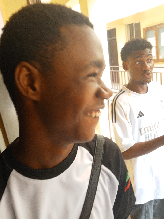 Two young males are depicted in an outdoor or semi-outdoor setting within the city of Ihiagwa, Nigeria, likely on a building's veranda or walkway. In the foreground, a male with dark complexion and short dark hair is shown in right profile, wearing a white t-shirt with black raglan sleeves and a black shoulder strap, possibly from a bag. He displays a broad smile, revealing his upper teeth. In the mid-ground, a second male with dark complexion and short, curly dark hair is visible, slightly out of focus. He wears a white t-shirt with black vertical stripes on the sleeves, an Adidas logo, and "Emirates FLY BE" text on the chest. This individual is turned slightly left, looking right with wide eyes and an open mouth, suggesting active communication or surprise. Behind the subjects, a light-colored building facade with a window and a dark-colored metal railing are visible. The scene is brightly illuminated by natural light.