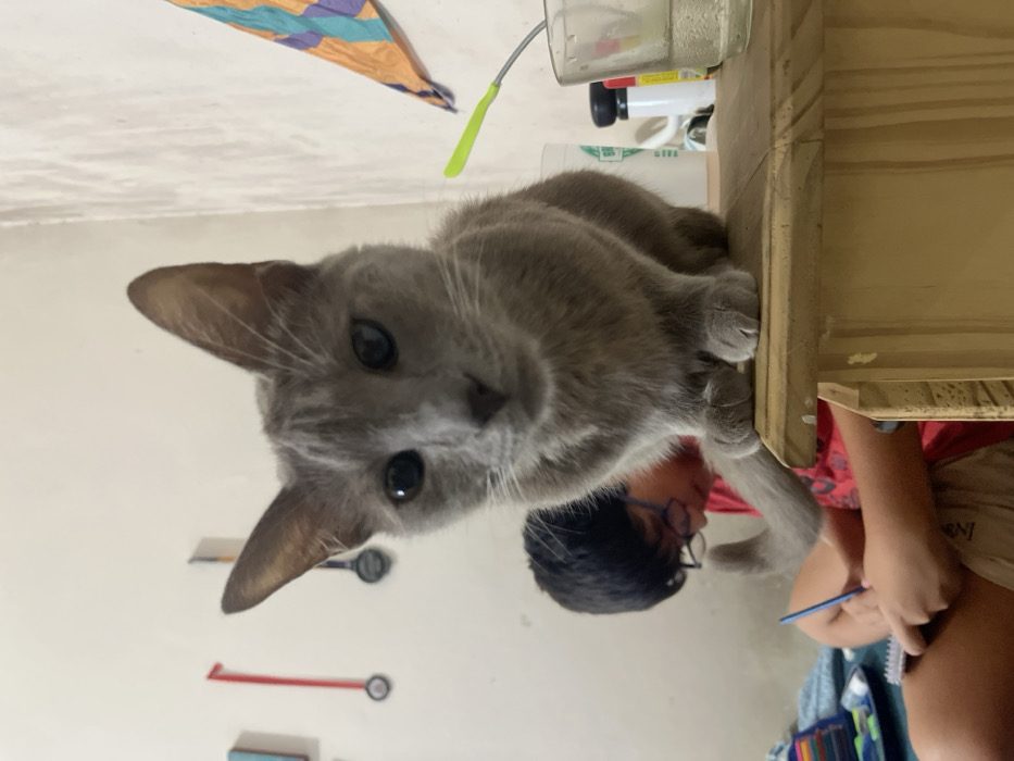 The scene is an indoor setting in Bernal Este, Argentina. A short-haired grey cat with dark eyes is the primary subject, positioned centrally in the foreground, seated on a light wooden surface, likely a nightstand or small table. The cat faces directly forward, with its front paws at the edge of the surface. Behind the cat, slightly to the left, a young male individual with short dark hair and eyeglasses is seated on a lower surface, possibly a bed. He wears a red short-sleeved shirt and light-colored shorts, and is actively writing in a small, white spiral-bound notebook with a blue writing utensil. The cat's tail is visible curving behind it, near the individual. To the right of the cat, on the wooden surface, are a clear glass containing liquid, a white plastic cup, and several other smaller containers. A flexible object with a bright green tip extends upwards from behind these items. The background wall is a plain light color, adorned on the left with two medals suspended by red and black ribbons, and on the right with a multi-colored, patterned fabric object, possibly a kite.