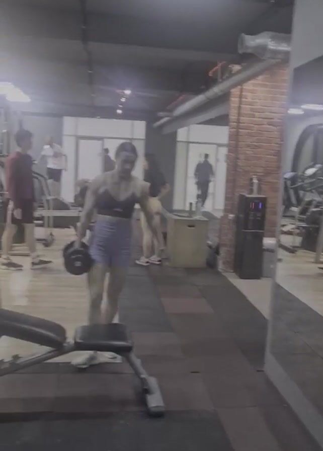 Here's a breakdown of the video: The video shows the interior of a gym. The lighting is a bit dim and somewhat industrial. In the initial shots, a woman wearing a sports bra and blue shorts walks through the gym, holding dumbbells. Other people are present in the background, working out on various machines. The camera pans across the gym, showing exercise equipment, weights, and a large window with a nighttime cityscape visible outside. A man in a black tank top is seen near a rack of dumbbells, picking up one of the weights.