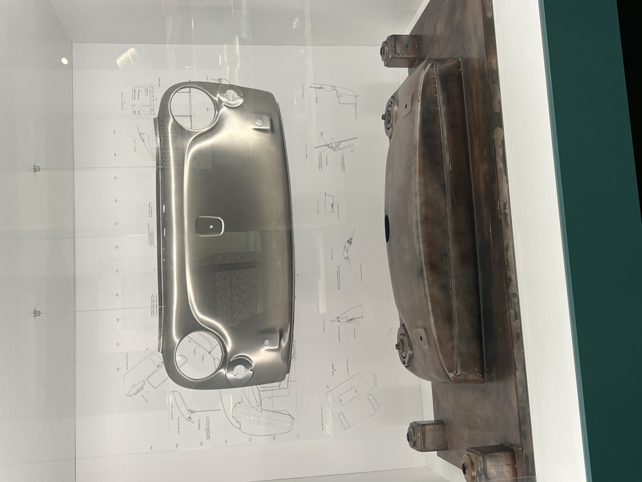 The image depicts an industrial design exhibit inside a museum, likely the Museo Nazionale della Scienza e della Tecnologia Leonardo da Vinci in Milan, Italy. The central subjects are two metallic components related to automotive manufacturing, enclosed within a glass display case. The upper object is an unfinished, brushed metal car front panel, horizontally oriented and suspended against a white background. It features two prominent circular cutouts for headlights, smaller indentations, and a central rectangular recess, consistent with the bonnet and front fascia of a vintage compact car like the Fiat 500. Technical drawings and blueprints of automotive components are visible on the white wall behind this panel. The lower object is a large, dark, oxidized metallic stamping die or mold, designed to form the upper panel. It rests horizontally on a darker metallic base, accompanied by four smaller, rectangular metallic blocks positioned at its corners. The die exhibits a curved, elongated shape with a central circular opening and other surface features mirroring the contours of the car panel. The display case itself has a dark green base with a white trim along its top edge. Reflections from the museum environment are visible on the glass surface of the display. No people are present in the frame.