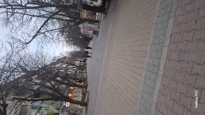 The image displays a pedestrian street located in Shumen, Bulgaria. The street is paved with interlocking concrete pavers, predominantly reddish-brown and beige, with a distinct central strip of grey pavers. Mature, deciduous trees with bare branches line both sides of the street, suggesting an autumn or winter season. On the left, multi-story buildings feature ground-floor commercial establishments, including an "A1" telecommunications store with illuminated signage. A wooden bench is visible near the trees on this side. On the right, several outdoor kiosks or stalls with glass display cases are present, along with tables and chairs, indicating commercial activity. Approximately five to seven individuals are observed walking away from the camera in the mid-ground, along the central pathway. Additional indistinct pedestrians are visible further down the street. The sky above is light blue with scattered clouds, indicating ambient daylight. The image includes a "Galaxy A55" watermark in the lower left corner.