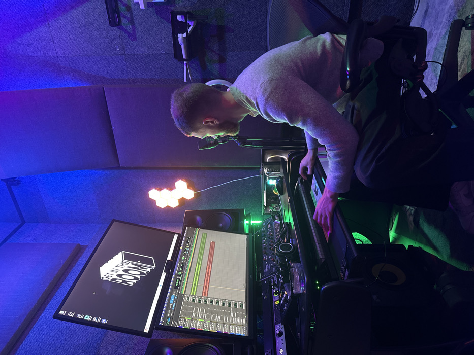 man sitting at a computer desk, wearing a grey sweater and black pants, in a room with soundproofing panels on the walls. The room is lit with purple and blue lights. The man has a microphone in front of him and is using a computer with a large monitor. The monitor is showing a software application interface, and the words “Get in the Room” are visible on a smaller monitor. The man's right hand is resting on a keyboard. There is a large black speaker to the man's left and a smaller one to his right. The man is facing to the right and is looking at the computer. The coordinates provided indicate a location in the city of New York, USA, but the image provides no context to suggest this is where the scene is located.