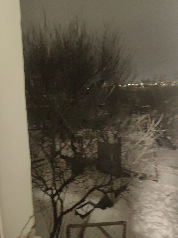 A blurry, dimly lit outdoor scene is captured from indoors, likely through a window