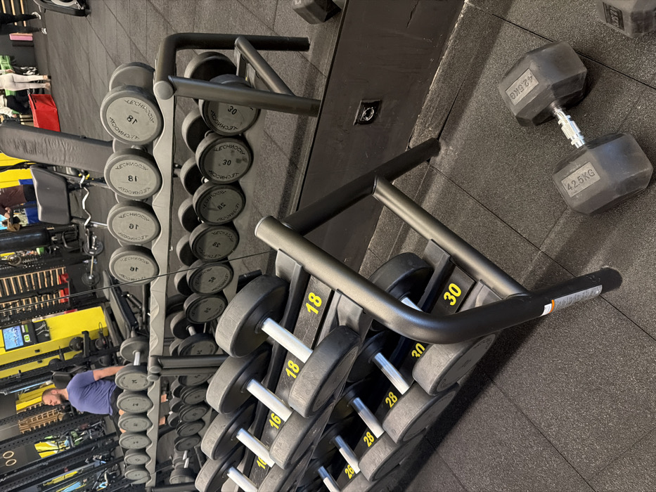 This image depicts the interior of a fitness gym in Sofia, Bulgaria, characterized by modern Technogym equipment. The scene is dominated by a black, multi-tiered dumbbell rack positioned in the midground and foreground. The rack holds numerous grey, hexagonal dumbbells, sequentially numbered with yellow markings (e.g., 16, 18, 28, 30), indicating their weight in kilograms. Each dumbbell is branded "TECHNOGYM." The floor is covered with black rubber mats. To the right of the dumbbell rack, two loose, hexagonal dumbbells, each marked "42.5KG," rest on the floor. A large mirror lines the wall behind the dumbbell rack, reflecting the broader gym environment. In the reflection, a male individual is visible seated on a black weight bench, facing away from the camera. He wears a blue t-shirt and dark shorts. Other blurry figures and various gym equipment, including additional weight racks, machines, and yellow accent walls, are also present in the background reflection. The lighting is bright and artificial, illuminating the workout area.
