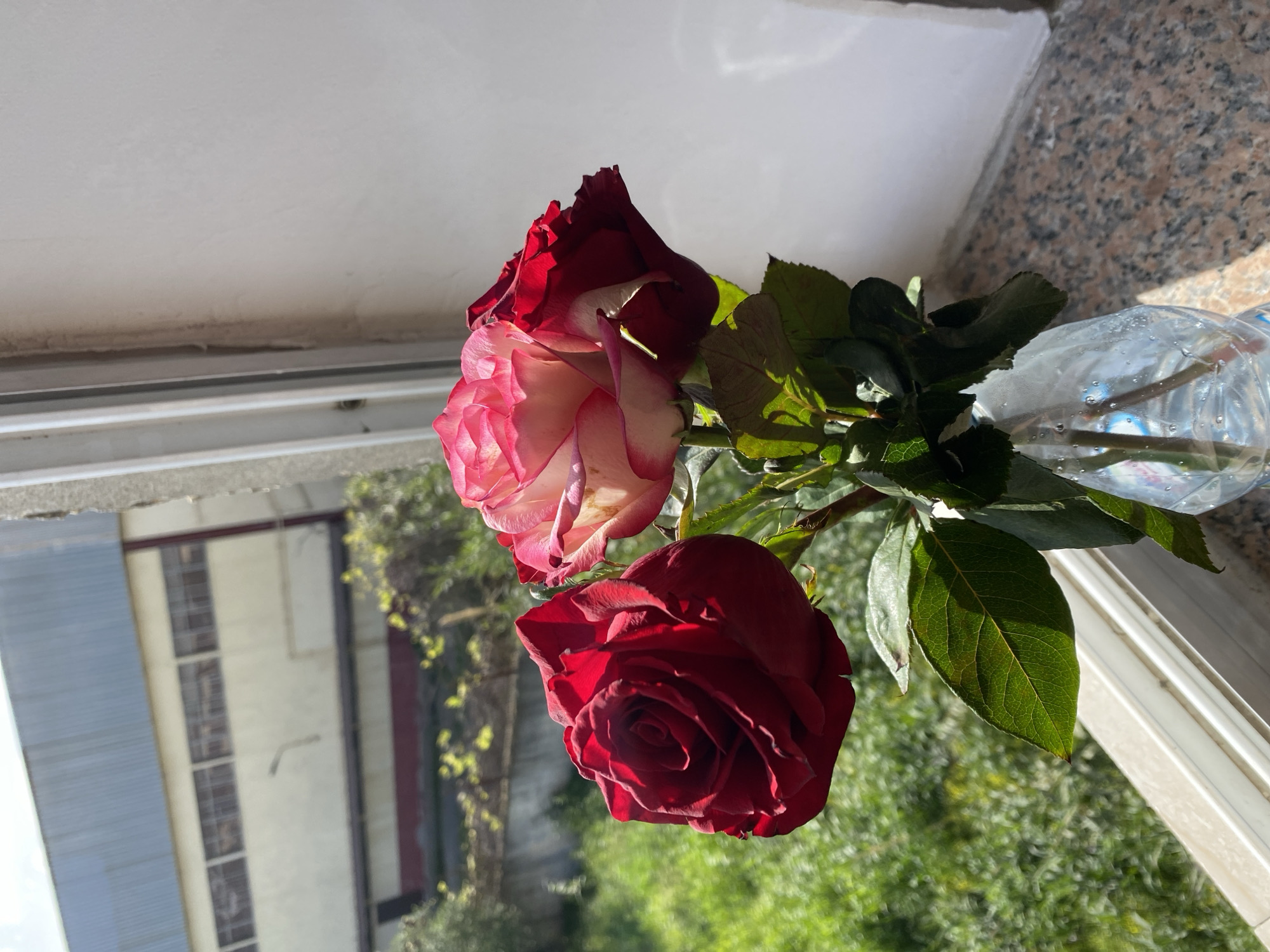 The scene is observed from an interior perspective, looking out a window in the city of Baraki, Algeria. In the foreground, three cut roses are arranged in a clear plastic bottle serving as a vase, placed on a speckled granite windowsill. The prominent rose on the left is a deep red, while another behind it displays a pink-to-white gradient. Green leaves are visible on the rose stems. Strong sunlight illuminates the roses, casting shadows on the windowsill and wall. To the right, a plain white wall is visible. Outside the window, a lush green area with vegetation is present. In the background, a large industrial-style building with a light-colored facade and a blue corrugated metal roof is visible. The building features a series of horizontal rectangular windows and a visible street light fixture on its exterior. A red horizontal stripe is present along the lower section of the building's visible facade.