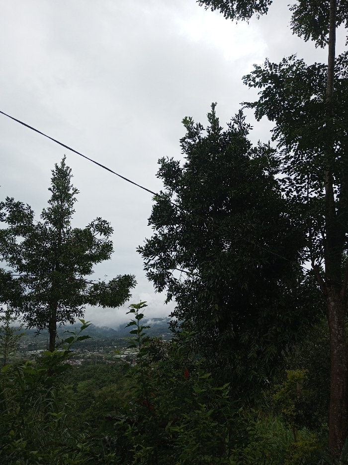 The image displays an elevated vantage point overlooking the city of Ambakirano, Madagascar, under an overcast sky. The foreground is dominated by dense, dark green foliage and tree trunks, framing the view. A black cable extends horizontally across the upper-mid portion of the frame. In the midground, a sprawling urban settlement composed of numerous buildings, some with light-colored roofs, is visible nestled within a valley or among lower hills. Distant rolling hills and mountains, partially obscured by low-hanging clouds or mist, form the background. The sky is uniformly grey and overcast. There are no individuals, animals, or discernible actions present in the scene.