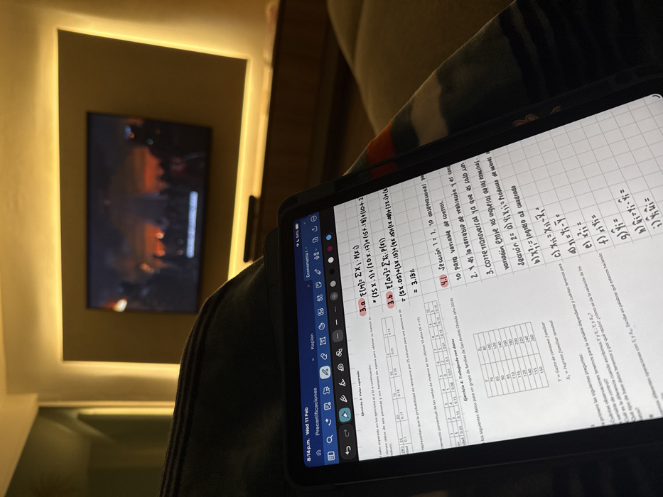 handwritten econometrics notes on a tablet. The notes include statistical formulas, calculations, and explanations related to expected value, probability, and variable analysis. It also presents a data set for a group of families, including income and consumption. The notes are likely for a course or study session on econometrics. Additionally, there is a TV in the background.