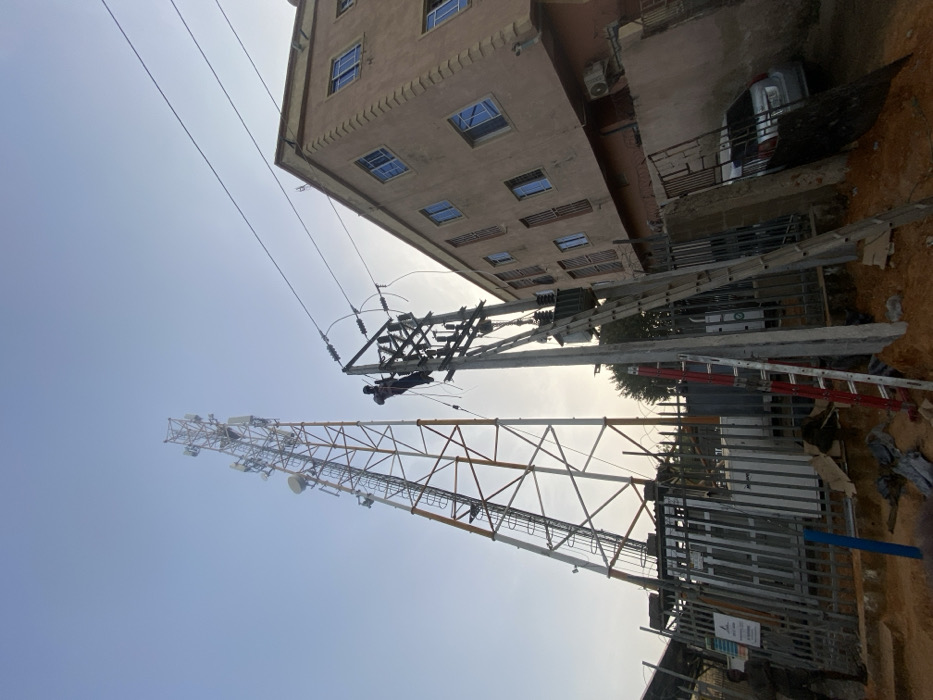 A telecommunications tower rises beside a utility pole with a worker. A building stands adjacent, featuring multiple windows and an air conditioning unit. Ladders lean against the utility pole and building, suggesting ongoing work. Fencing and construction materials surround the base of the tower. A vehicle is partially visible near the building, and the sky is a clear blue.