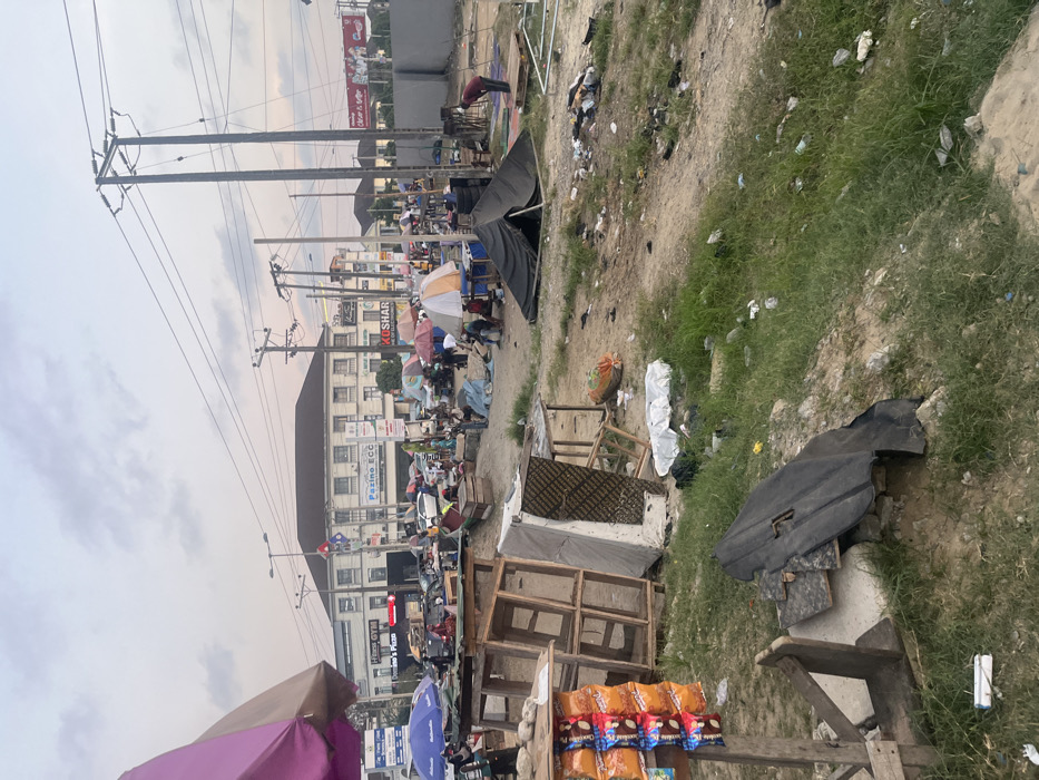 A bustling market scene shows vendors under colorful umbrellas lining a street with multi-story buildings. Utility poles and power lines run alongside the buildings, suggesting an urban setting. The foreground displays a makeshift stall stocked with snacks. A grassy area to the right is littered with debris and materials, highlighting a contrast between commercial activity and a lack of waste management.