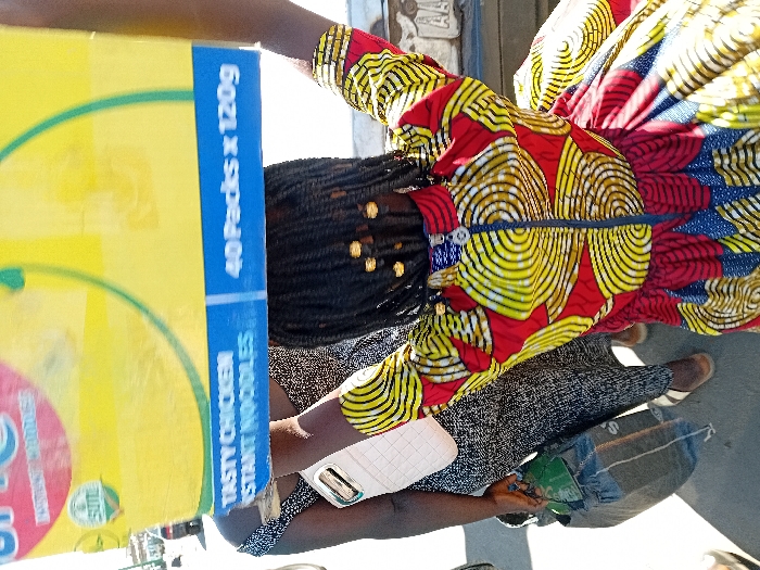 An outdoor scene in Jos, Nigeria, depicts two individuals walking on a paved surface under bright daylight. The primary subject, seen from behind, is a person wearing a vibrant African print dress in red, yellow, and blue patterns. This individual carries a large yellow cardboard box on their head, identifiable by legible text as "TASTY CHICKEN INSTANT NOODLES" and "40 Packs x 120g." Their arms are raised to stabilize the load. To their immediate left, a second person, partially visible, wears a dark patterned outfit and a white, possibly quilted, shoulder bag. This individual carries a dark grey or black sack with green handles in their left hand. The immediate background shows a blurred urban environment with what appears to be a street and vehicles.