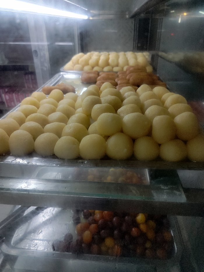 display case containing various sweets. The case is made of stainless steel with glass shelves. The top shelf contains two layers of round, off-white sweet, possibly gulab jamun. The bottom shelf contains a tray of small, round, brown, orange and purple sweets. The case appears to be in a sweet shop located in Barishal, Bangladesh, based on the provided coordinates. The lighting is fluorescent, casting a white glow on the sweets. The sweets are displayed in a clean and organized manner.