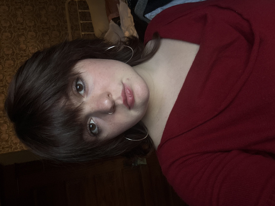 A young woman with fair skin, dark brown hair with bangs, and brown eyes is angled slightly towards the camera. She wears a red long-sleeved shirt and large silver hoop earrings. A silver nose ring is visible on her left nostril. The background shows a patterned wall, possibly wallpaper, and some bedding or clothing. Lighting is low, creating shadows on her face and adding to the overall mood of the image.