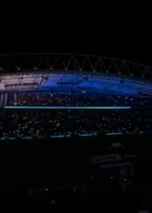 nighttime view of a stadium filled with people, many holding up lights that resemble stars in the dark. The stadium lights cast a blue glow, highlighting the architecture and roof structure. The field is visible, but dark. The crowd appears dense, their individual features indistinct due to the low light.