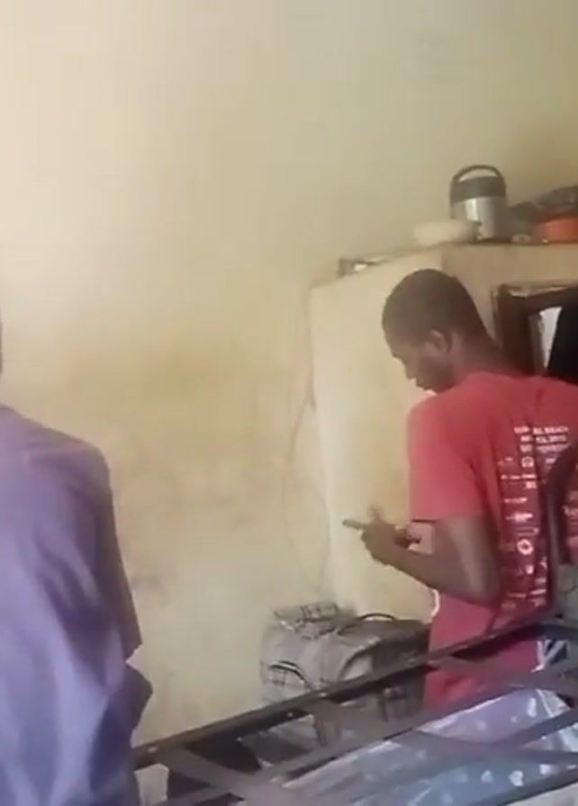 sparsely furnished room. Two young men are present. One is wearing a red t-shirt and is looking at his phone while standing next to a bed frame. The other is wearing a purple shirt and is sitting with his back to the camera. There is a wardrobe in the background with some items on top. A small window with a view to outside is also visible. The walls are painted a light color.