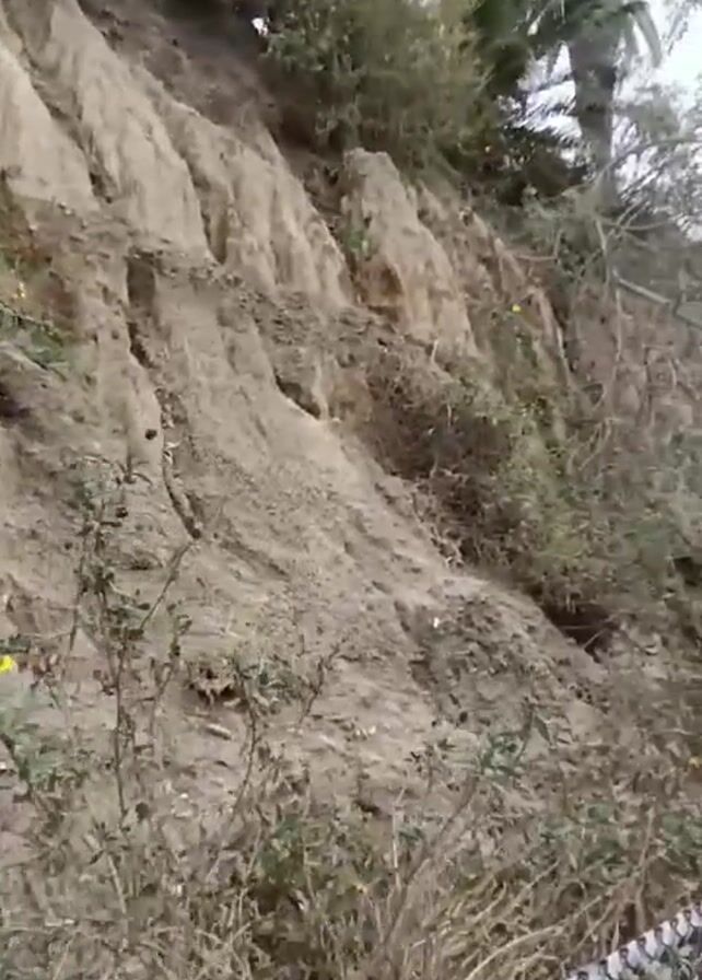 group of people walking along a path beside a steep dirt embankment covered in vegetation. The embankment has visible signs of erosion. A chain-link fence separates the path from the embankment. Palm trees are visible in the background. The sky appears overcast. The camera follows the group as they walk. Conversations can be heard in the background.