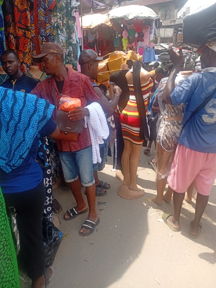 The image depicts a crowded outdoor market scene in Fegge, Nigeria