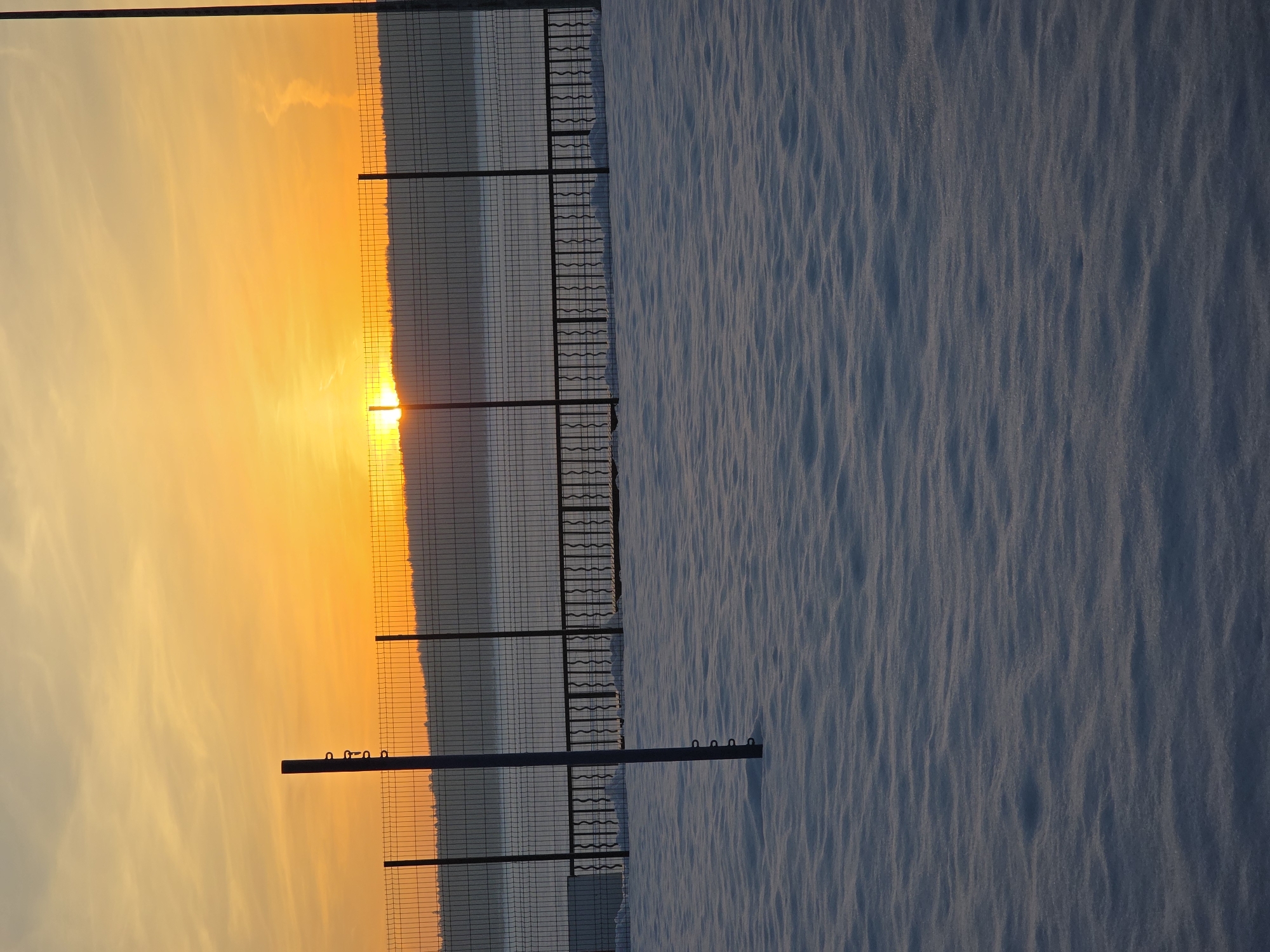 The image depicts a sunset over a snowy landscape in Chaikovsky, Russia. A metal fence runs vertically through the scene, dividing the frame. To the left of the fence, the setting sun casts an orange glow over the sky and the land behind the fence. The sun is partially obscured by the horizon. To the right of the fence, the ground is covered in snow, with wind-blown patterns creating shadows and textures. There are no people or visible actions in the scene.