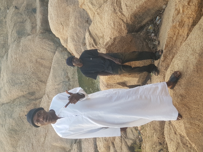 Two men pose on tan rocks. One man wears a long white robe and a black cap. He gestures with his hand. Behind him, another man in a black shirt, pants, and a black cap stands nearby. The background is composed of large rock formations and some sparse vegetation. The lighting suggests an outdoor setting with sunlight.
