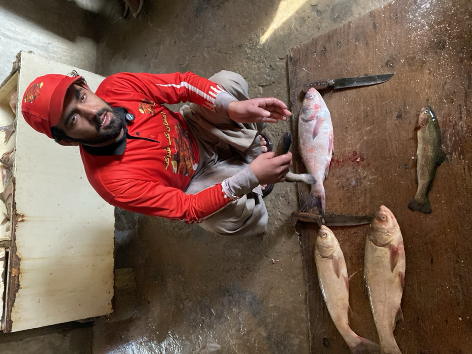 In Deh Sabzi, Afghanistan, a male individual is depicted in a fish preparation area