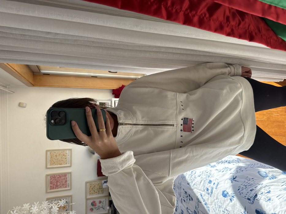 An individual is depicted in a mirror selfie, obscuring their face with a dark green smartphone featuring a triple camera lens array. The setting is an interior room in Vila Nova de Gaia, Portugal, identifiable as a bedroom. The person is wearing an off-white, long-sleeved quarter-zip pullover sweatshirt with a high collar and black leggings. The sweatshirt's chest features embroidered text reading "LOS ANGELES" and "1984," separated by an American flag graphic, all appearing reversed due to the mirror reflection. A gold-toned ring is visible on the ring finger of the left hand, which holds the phone. A light-colored fabric scrunchie is present on the left wrist. The reflected background reveals white walls and ceiling. To the left, a bed is covered with a white sheet patterned with blue marine motifs, specifically jellyfish or squid. Above the bed, several framed botanical art prints with light backgrounds and colorful floral designs are mounted on the wall. White paper floral decorations are suspended near the ceiling in the upper left. To the right, a wooden-framed window or door is visible, partially covered by white pleated curtains, through which natural light enters. On the far right edge of the frame, a segment of red and green fabric is partially visible.