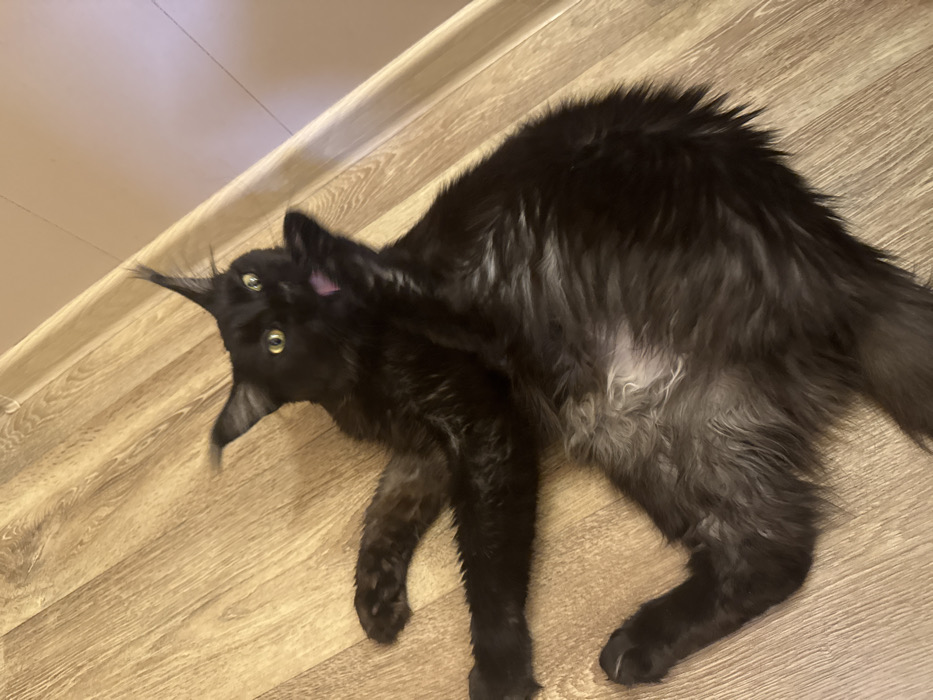A large, long-haired black domestic cat, exhibiting characteristics consistent with a Maine Coon breed, is depicted lying semi-supine on a light brown wood-patterned laminate floor