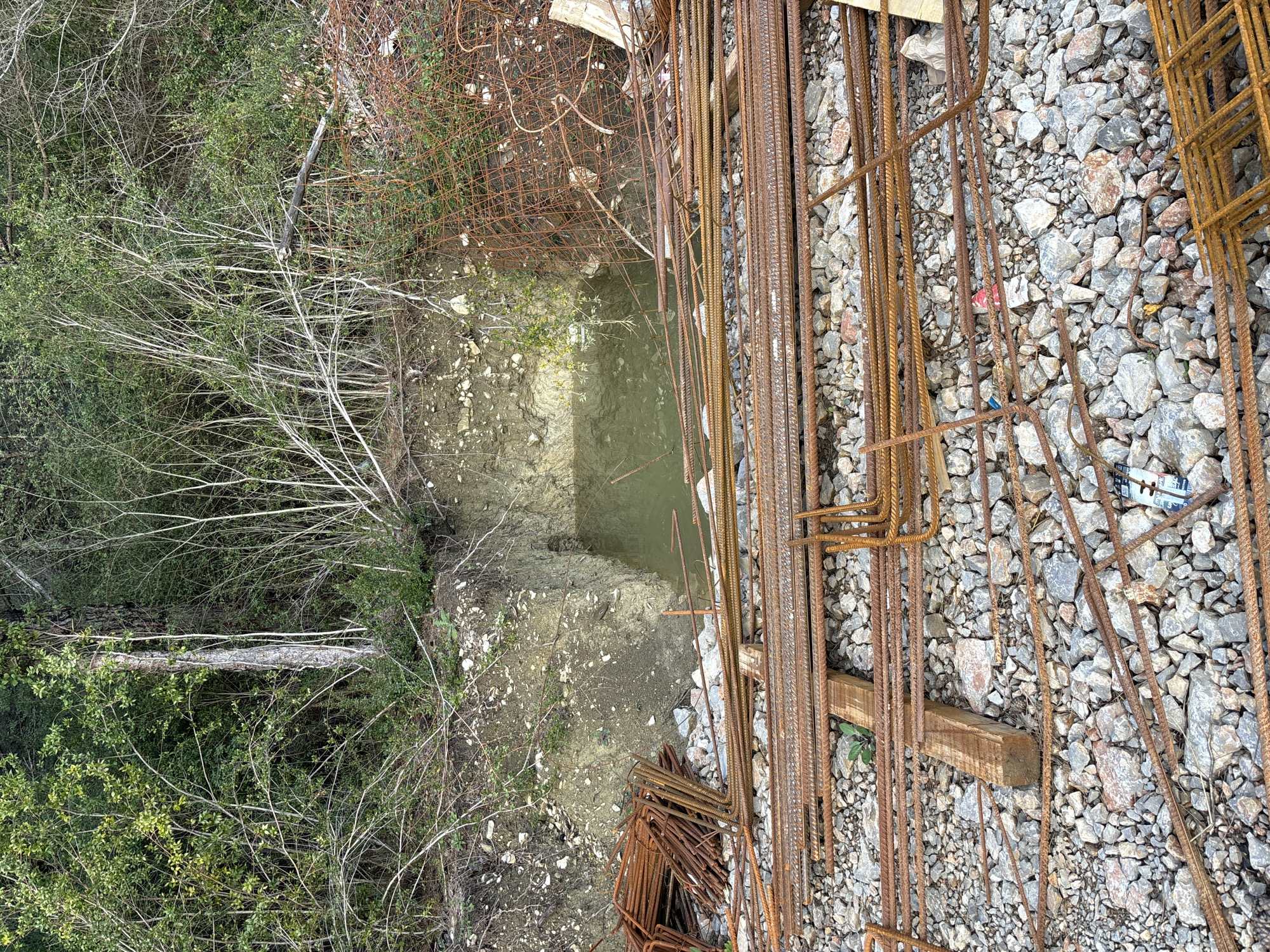 The scene is located in Kavač, Montenegro, depicting an outdoor area combining a construction material storage zone with natural terrain. The foreground presents a ground composed of mixed grey and reddish gravel and dirt, densely covered by rusty steel rebar. This rebar is arranged in multiple bundles of straight bars, individual bent sections, and large, flattened grid meshes. Interspersed among the rebar are several aged wooden planks. Minor discarded items, including plastic debris and a white bag, are visible on the gravel. Mid-ground features an excavated pit, exposing light-colored soil layers, partially filled with still, murky green water. Adjacent to this pit, a large quantity of heavily corroded rebar, including crumpled mesh sections and loose bars, is haphazardly piled, with some elements making contact with the water's edge. The background consists of an unmanaged, dense vegetated hillside. This includes a variety of trees and shrubs, exhibiting both full green foliage and numerous bare, thin branches. A single prominent tree with light-colored, possibly peeling, bark stands vertically within this natural backdrop. No personnel or active operations are observed.
