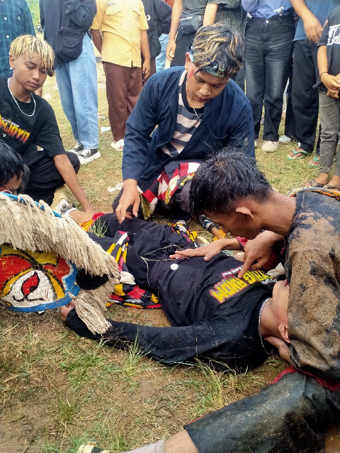 The image depicts an outdoor scene in Sidomukti, Indonesia, showing four individuals in the immediate foreground attending to a fifth person lying on the ground, with several other onlookers in the background. In the center, a male individual is lying supine on damp, grassy ground, wearing a black long-sleeved shirt with yellow text, partially visible as "WORO NGENDHONG," and a silver chain around his neck. To his right, another male individual, covered in mud stains on his face, arms, and dark clothing, is crouched, leaning over the supine person. He points with his right index finger towards the supine person's chest area while his left hand rests near the supine person's head. To the left of the supine person, a third male individual kneels, wearing a dark blue jacket over a striped shirt, a patterned sarong-like garment, and a bandana on his head. His right hand rests on the supine person's abdomen. A visible red mark or scratch is present on the right side of this individual's forehead/temple. Adjacent to the supine person's left side and partially obscuring a fourth individual's lower body, is a large, elaborate, colorful mask-like costume piece, primarily white and red with black and yellow accents, featuring prominent "straw" or fringe-like elements. This costume piece appears to be held by the fourth individual, whose arm is visible holding it near the supine person's head. The ground consists of green grass interspersed with patches of damp earth and mud. In the background, several other individuals, dressed in casual attire including jeans and t-shirts, are standing and observing the scene.