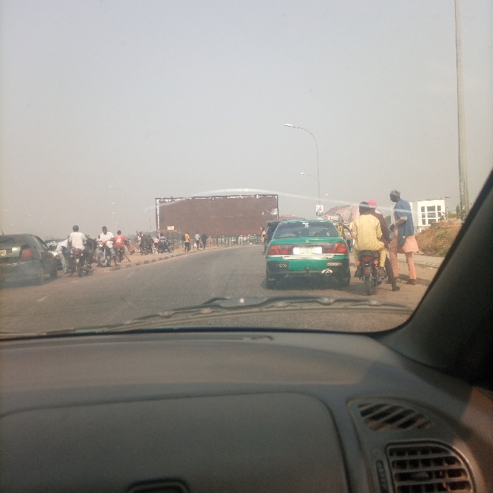 This image presents a daylight road scene in Gwarinpa, Nigeria, captured from within a vehicle under a hazy sky