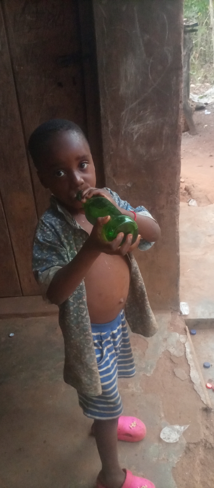 A young, dark-skinned child is drinking from a green glass bottle. The child is wearing a patterned, button-down shirt and blue-and-white striped shorts. Pink sandals adorn the child's feet. The child's stomach is visible. The child stands on a concrete surface in front of a brown wooden wall. Bottle caps and plastic litter the ground near the child's feet. The background shows a blurred outdoor scene.
