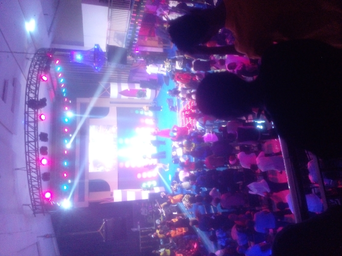 A crowded auditorium scene displays a stage brightly illuminated with spotlights and LED bars, framed by a curved truss