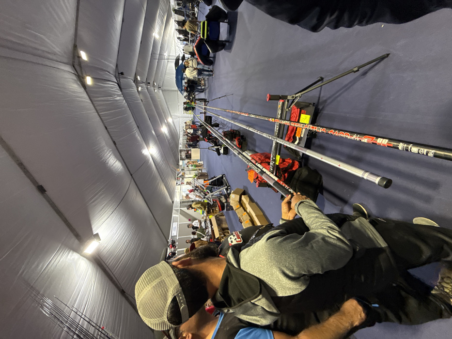 The image depicts an indoor exhibition or market within a large, white canvas tent structure, illuminated by overhead rectangular LED lights. The event is located in the city of Mora, Portugal, and features merchandise related to fishing. The floor is covered with a dark blue carpet. In the foreground, a male individual is prominently featured from behind, wearing a light grey mesh trucker hat, a grey hooded sweatshirt over a black shirt, and dark pants. He has a dark beard and is actively examining a section of a fishing rod, holding it with both hands. To his right, two long fishing rods are displayed horizontally on black, tripod-style adjustable stands. The rods feature black base sections with red, white, and yellow graphics, including "BLACK SHADOW" and "CUSTOM RAGOT" text, and extend into silver-grey upper sections. Black bags and a red item are visible on the floor beneath the rods. A partially visible individual in dark clothing is present on the far right. The midground and background reveal numerous people milling around various vendor stalls defined by white partition walls. These stalls display a variety of goods, including smaller items on tables, and larger equipment such as inflatable fishing vessels (float tubes) and other fishing gear. A blue umbrella covers one display area further back. The overall scene indicates an active trade show or fair focused on fishing equipment.