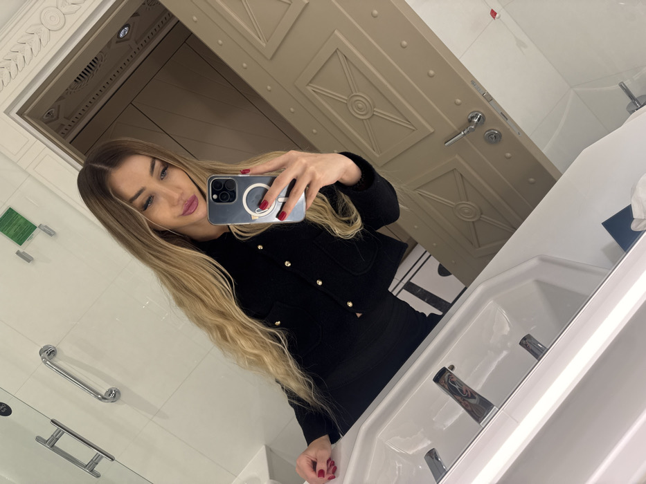 A blonde woman takes a mirror selfie in a bathroom. She wears a black, buttoned jacket and skirt. Her phone is visible in her hand, and she has red nail polish. The bathroom features a patterned door, a sink, and chrome fixtures. The tiles and the overall design of the bathroom have a modern aesthetic.