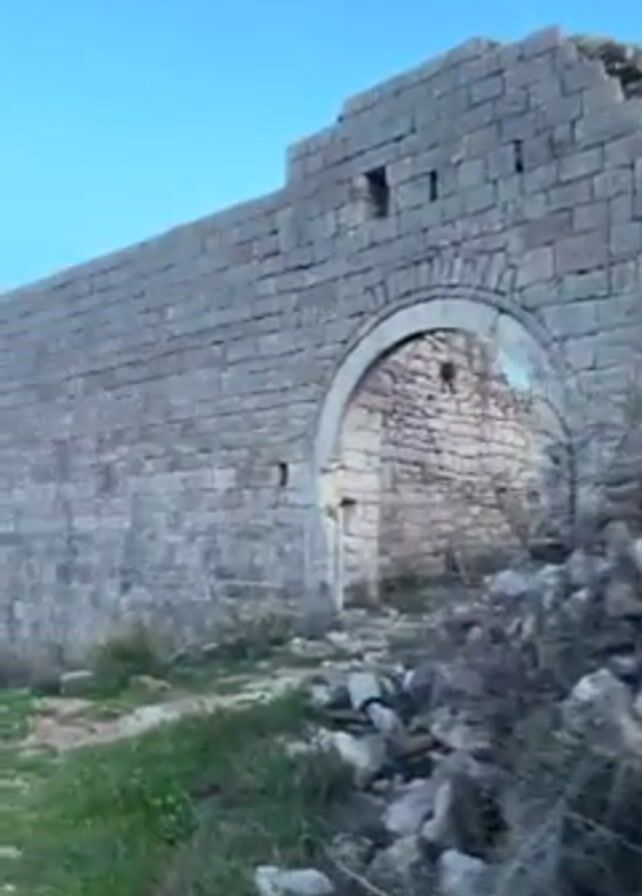 The camera slowly pans up and to the right, focusing on a large, old stone wall with a prominent arched doorway. The wall appears to be part of a ruined structure, constructed from rectangular stone blocks. There are small, rectangular openings in the upper part of the wall. The area around the wall is overgrown with sparse greenery and scattered rocks and rubble. The sky above is a clear, light blue.