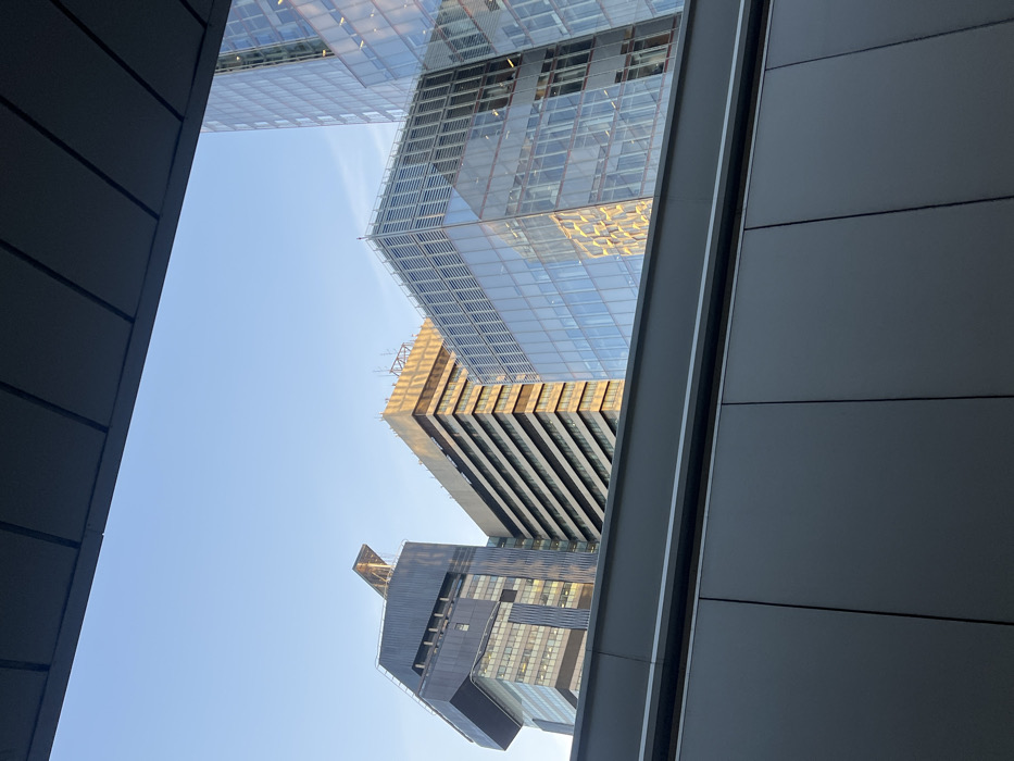 Looking up, skyscrapers dominate the view