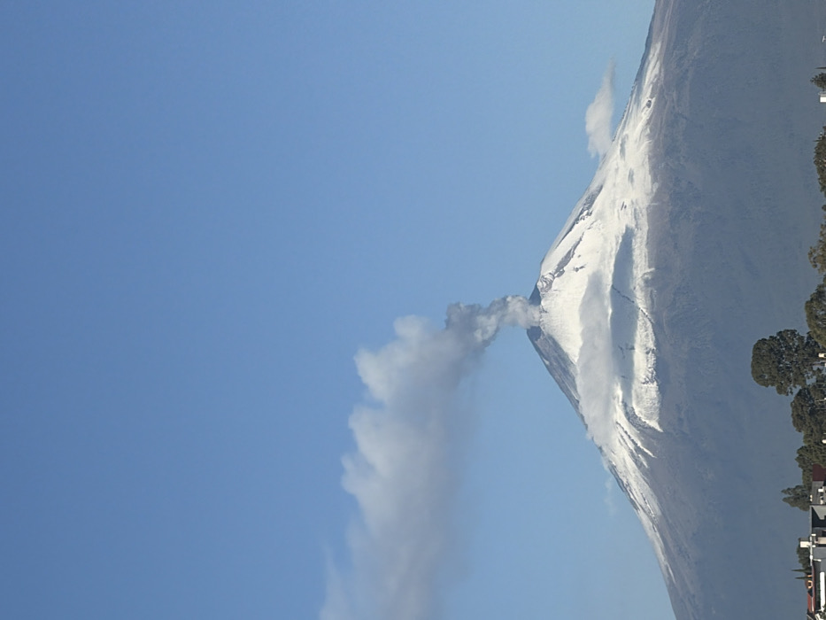 - "The image displays the active Popocatépetl volcano, snow-capped and emanating a plume of grayish-white smoke and ash, under a clear blue sky" by FM-Zevcw1, licensed under CC BY 4.0