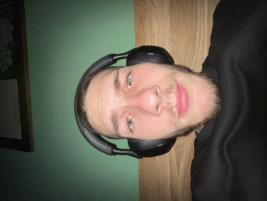 The scene depicts a male individual in a close-up, head-and-shoulders shot, situated indoors in Hà Nội, Vietnam. The subject, a young adult male, possesses fair skin, light brown hair styled short, and a light brown beard and mustache. He has light-colored eyes, possibly green or hazel, and his nose appears slightly reddened. He wears black over-ear headphones and a black long-sleeved top, possibly a sweatshirt. His facial expression is neutral, with lips slightly parted. Behind the individual, a light-colored wooden headboard or wall paneling is visible, horizontally oriented. Above this, a solid teal-green wall occupies the upper background. A framed item, partially visible in the top center, hangs on the teal wall; its specific content is indistinguishable. The lighting is moderate, highlighting the subject. No other individuals or direct interactions are observed. The environment suggests a private room, likely a bedroom.
